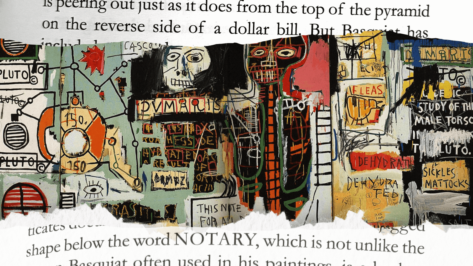 Jean-Michel was not an artist who enjoyed talking about his work. ‘It’s like asking Miles [Davis] how does your horn sound?’ he said in Tamra Davis’s Basquiat documentary Radiant Child. He did, though, provide some clues to Notary, a painting loaded with a cryptic concoction of references, including classical antiquity, Disney cartoons, racism, Leonardo da Vinci’s anatomical studies, the slave trade, Marxist theory, the Bible, modern art, planetology, chemistry, graffiti, African tribal symbols, hip-hop and Egyptian hieroglyphics.