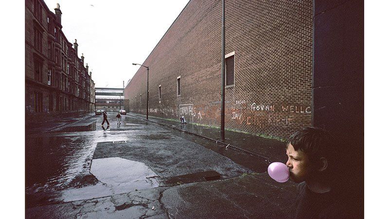 The boy with the pink bubble gum is Shuggie for me. I love how audacious that pink bubble is – bubble gum was the only pink thing boys were allowed so it’s kind of special. The image was taken next to the Govan shipyards [a major employer in Glasgow in the 1970s and 1980s] and you see the looming crush of industry that will catch all young boys in the city. You’ve got childish things such as drawn-on goalposts, right up against the biggest shipyards in the city. Childhood leads directly into manhood; they’re very close together, which is something I’ve tried to capture in my writing.