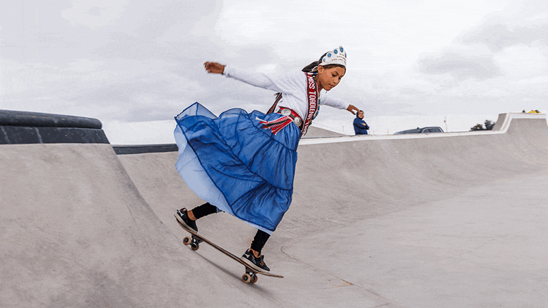 She describes moving back to Navajo Nation in 2019 as the most important thing she’s done, helping to improve her mental health and allowing for further connection to her Diné identity. “For me, being adopted out and coming back home, I have a unique way I see my indigeneity because of the pathway that I came into it,” she says. “I feel like it’s important to me as a community leader, as an older auntie... there has to be a safe space created where everyone can express their indigeneity in their own way. And that’s the beauty for me of the Diné Skate Garden Project, because it is that space. It’s a space for these young women to be who they want to be, and we’re going to always be protective of that.”