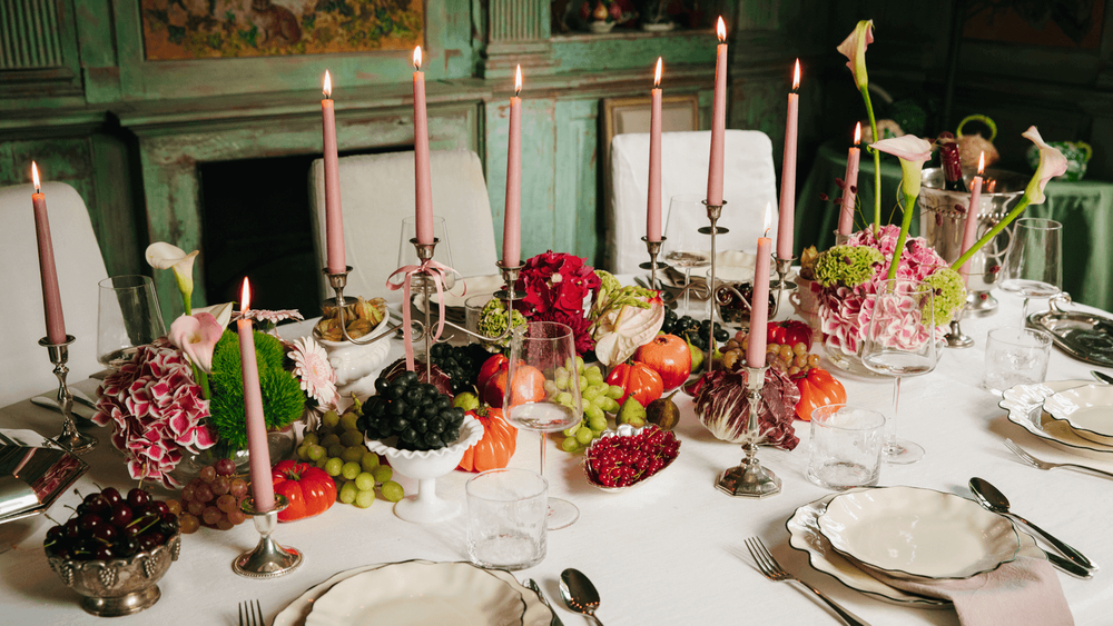 Pien Wekking, the Dutch cookbook author and founder of Pien’s Tables, may well be the queen of the tablescape. In her view, the chicest tables are all natural – think piles of grapes, gourds or citrus fruits that remind you of a renaissance still life. “There are so many props you can buy online but you may not use them again, and what if you’ve just decided to host a dinner tomorrow? Fruits and veggies can be picked up so easily,” she says. “I host friends almost every weekend, and recently I did an eggplant-purple table with browns and light pinks in the napkins and plates, which is such a cool twist on winter colours. I stuck tapered candles into the top of some pomegranates I picked up that day, tore some open to scatter around, then stuck dried orange slices to some vintage candleholders. I also never get tired of tying ribbon around loaves of bread; it’s festive and pretty.”